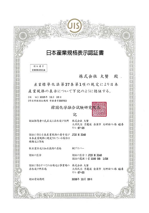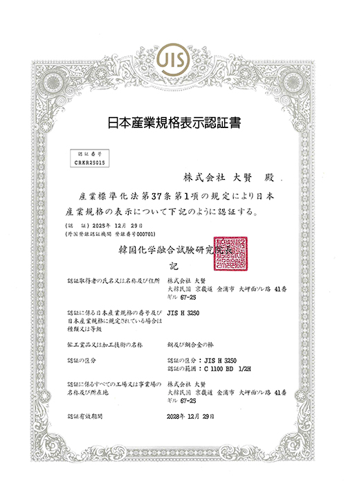 Japanese Industrial Standards Marking Certificate(Copper & Copper AlloyRod)