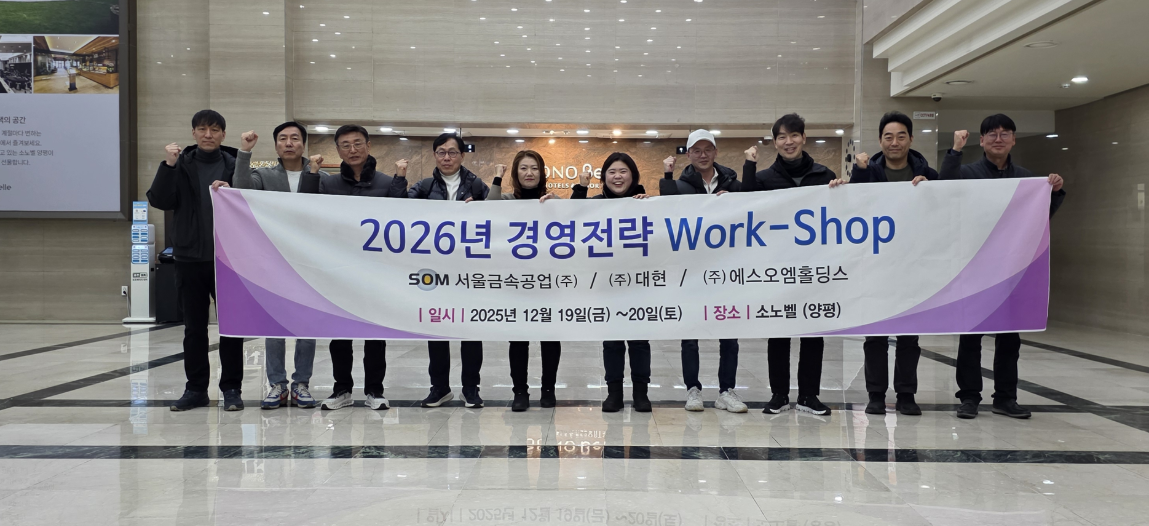 종합 전기 소재 글로벌 기업 SOM Group社(서울금속공업㈜, ㈜대현, ㈜에스오엠홀딩스)는 위기와 기회가 혼재하는 AI 대전환 시대인 2026년의 경영전략 수립을 위한 Work-Shop을 2025년 12월 19일(금)부터 20일(토)까지 양평 소노벨 리조트에서 실시하였다.