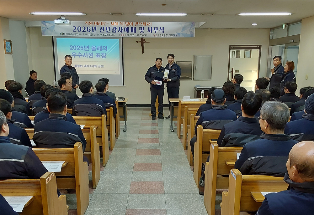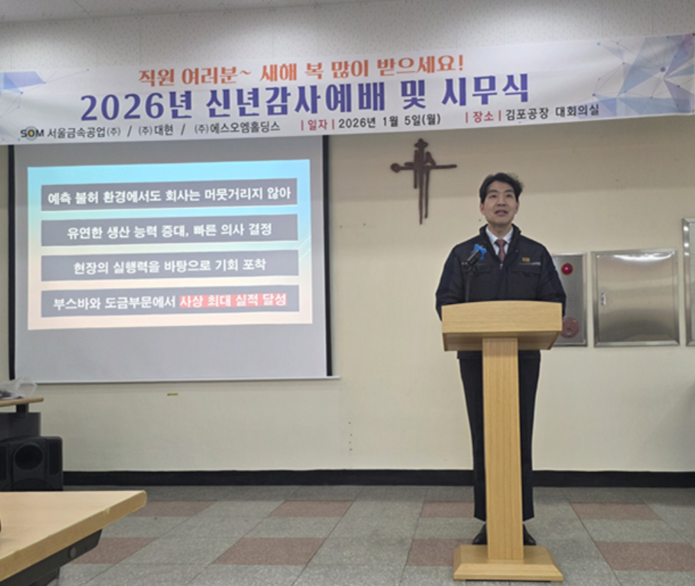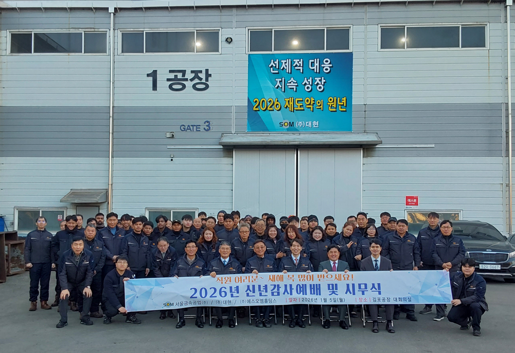 지난 5일, 에스오엠그룹(서울금속공업㈜, ㈜대현, ㈜에스오엠홀딩스)은 김포공장 대회의실에서 전 직원이 참석한 가운데 ‘2026년 신년감사예배와 시무식’을 개최하였다. 이날 행사는 전 계열사 임직원이 함께 모여 2025년 한 해 동안 무사하고 안전한 가운데 사상 최고 성과를 거둘 수 있었음과 새로운 2026년을 맞은 감사예배와 통합 시무식을 겸하여 실시하였다.